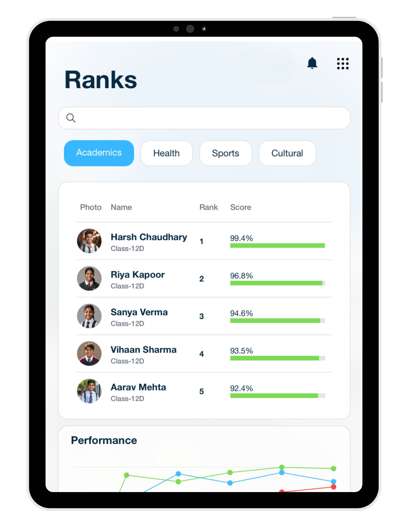Digital attendance tracking (biometric/RFID optional) with alerts for absences and insightful reporting.
